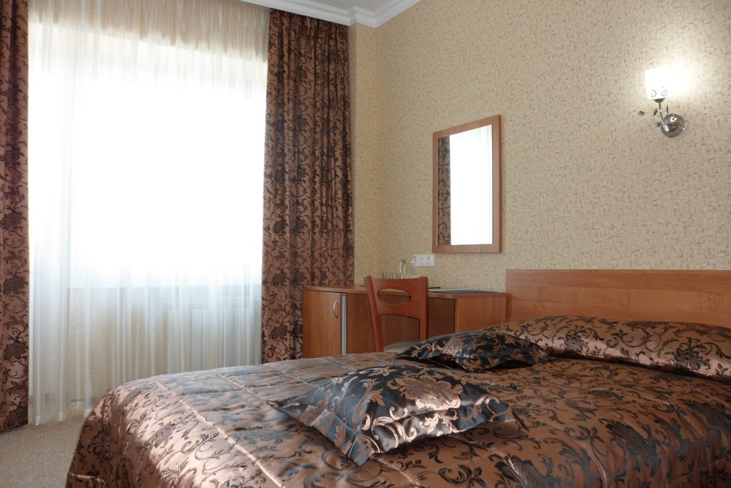 Площадь номера - 17 кв.м. 1 осн. место. 1 доп. место. Мебель: вешалка, зеркало, кровать двуспальная, стол, стул, тумба, шкаф. Оборудование: телевизор ЖК, холодильник, чайный набор посуды, электрочайник. Санузел: с душем, фен. Сервис: Wi-Fi бесплатно, смена полотенец, смена постельного белья, уборка номера.